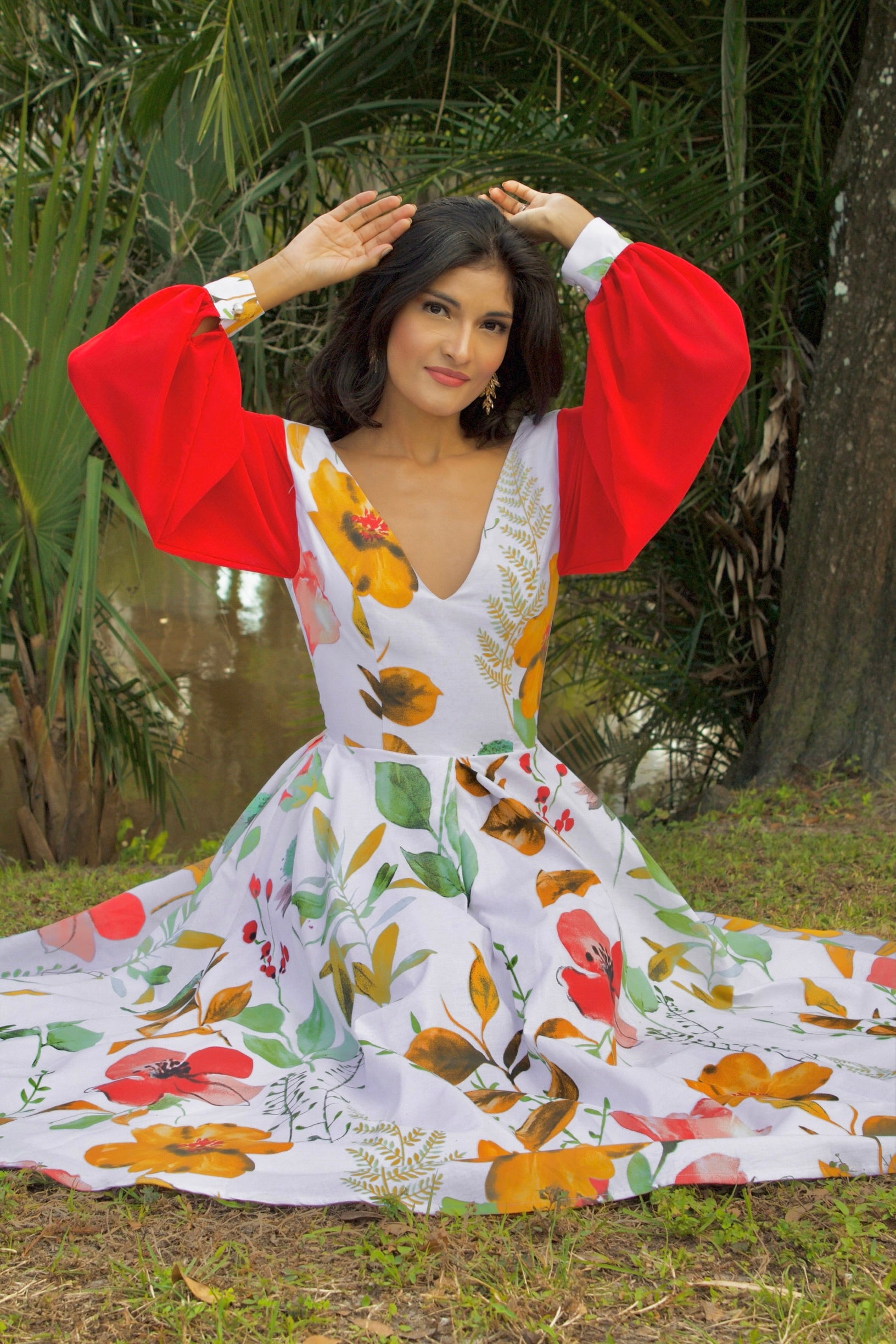 Featuring bold red long sleeves, a flattering deep V-neckline, and a beautifully full skirt, this unique women’s maxi dress is perfect for special events, garden parties, photoshoots, or any occasion where you want to make a stunning impression.